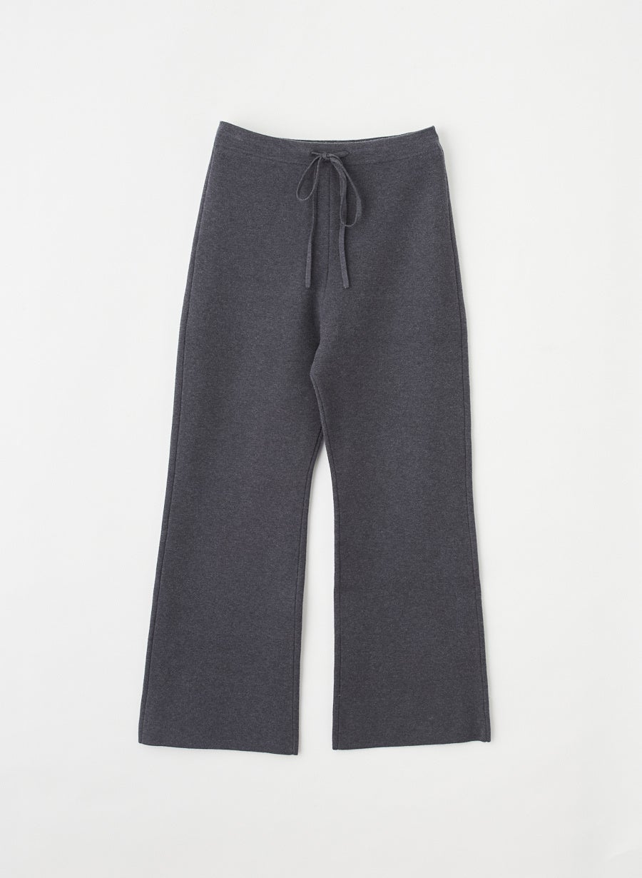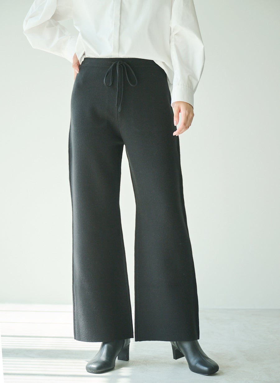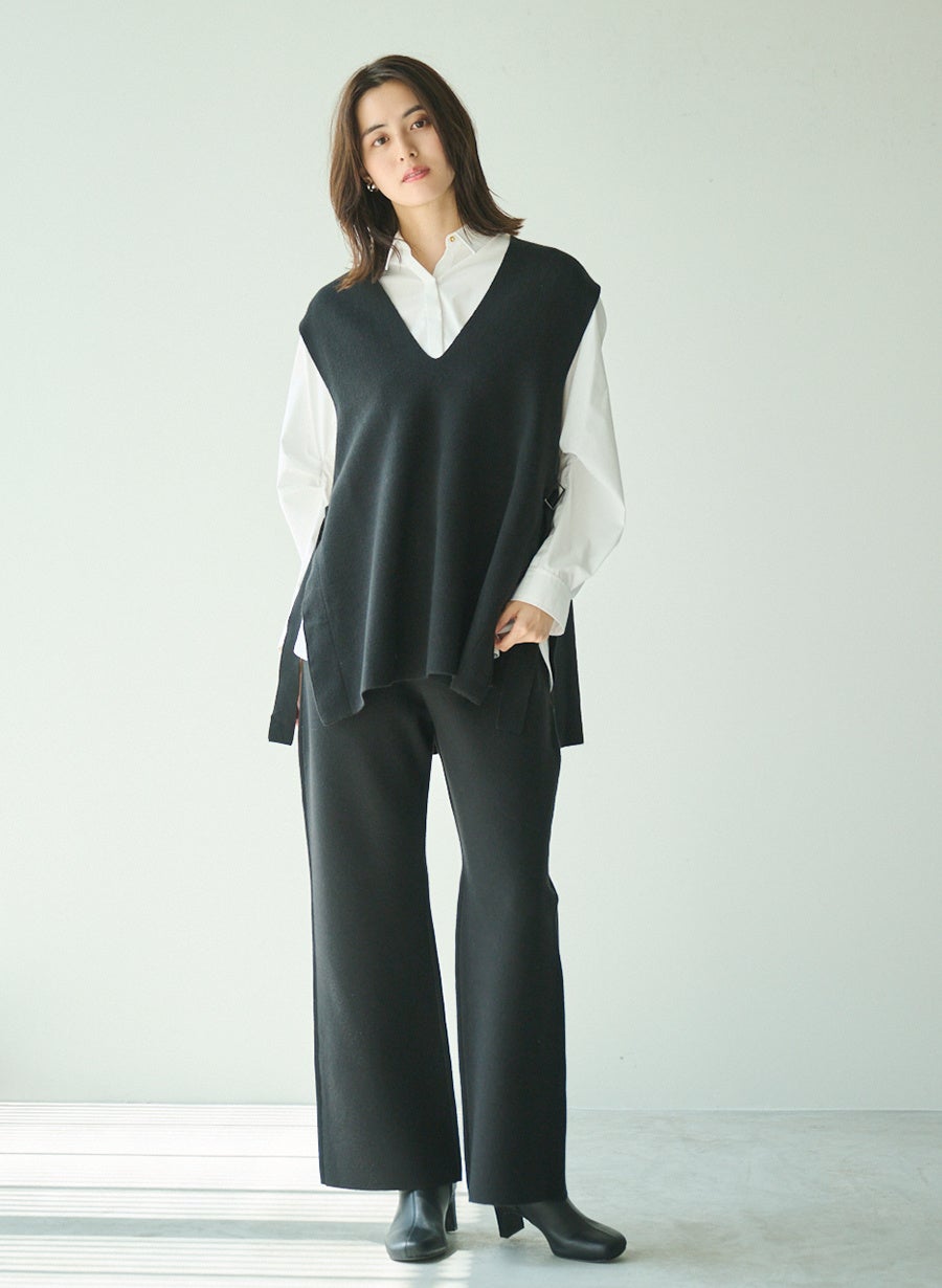 パンツは美脚見えが叶うセミフレアシルエット。ベストとパンツで編み方を変えているのもこだわりのひとつ。パンツの方は目を詰めてしっかりめに編むことで、立ったり座ったりしても型崩れしにくく、一日中きれいに着こなせる!