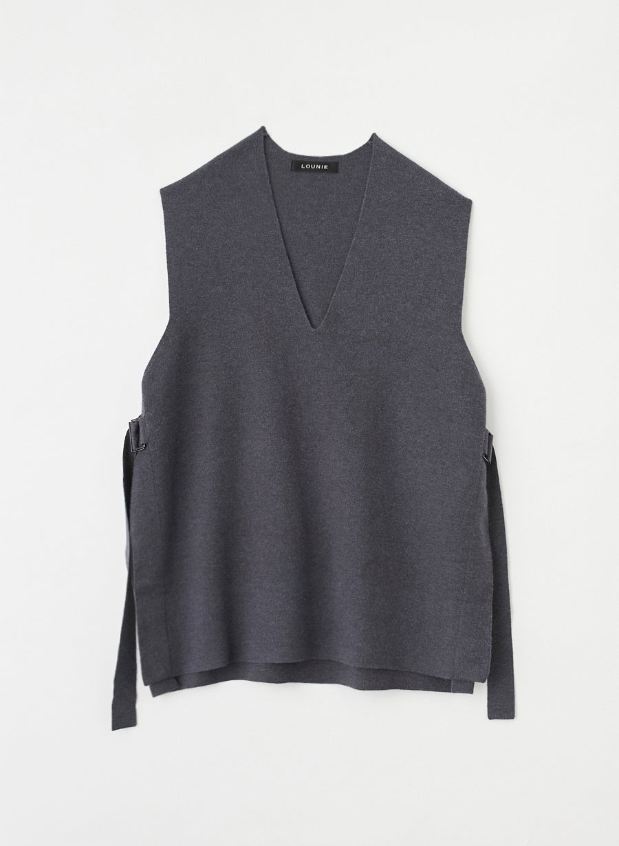 ベストのV開きはボウタイブラウスや襟付きシャツともバランスがとりやすい、狭く深めのデザイン。サイドにバックル&アレンジができるボタン付き。