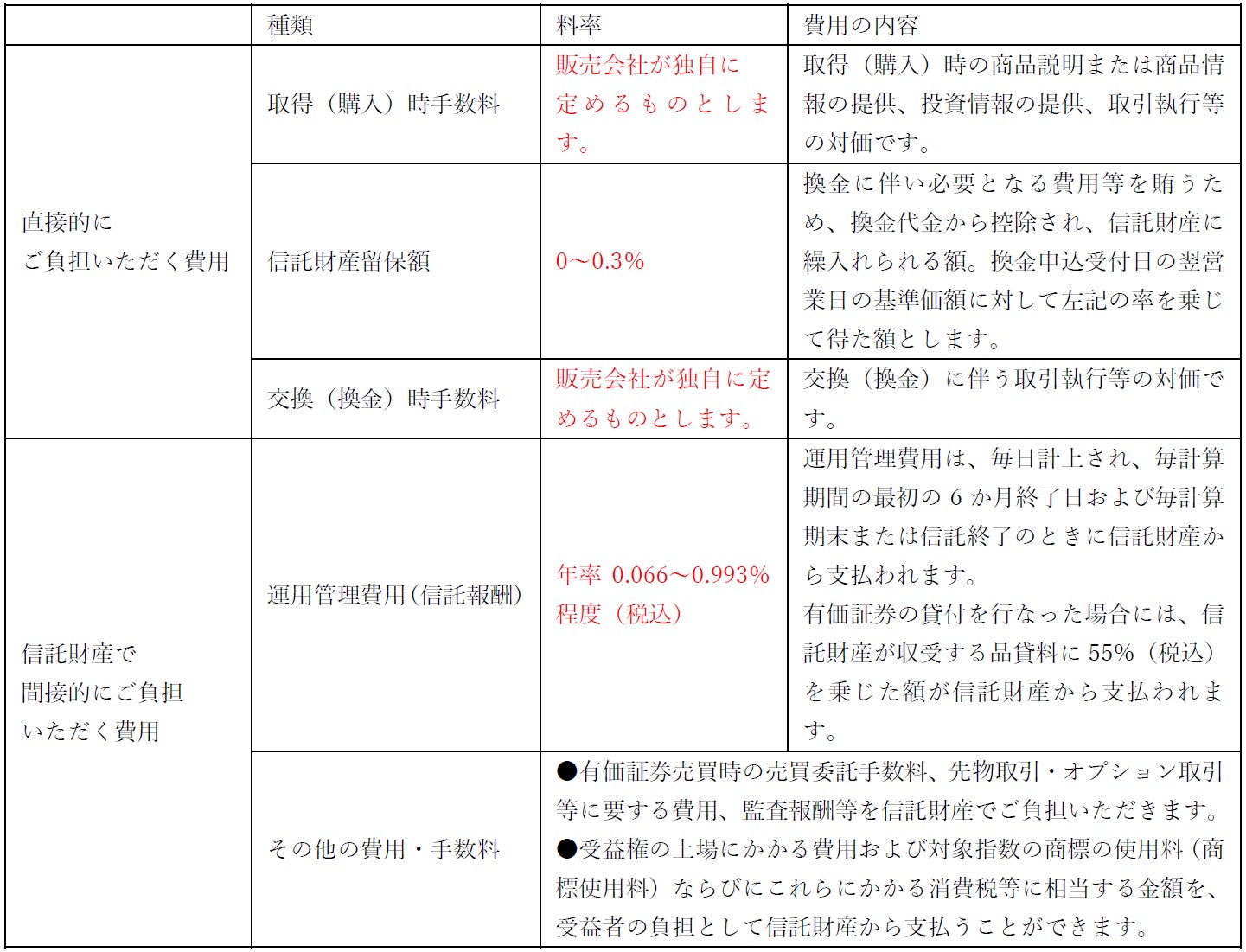 ※費用の種類や料率等は販売会社や個々のETFによって異なります。上記費用の料率は大和アセットマネジメントが運用する一般的なETFの料率を表示しております。※売買委託手数料などの「その他の費用・手数料」については、運用状況等により変動するため、事前に料率、上限額等を示すことができません。※取得(購入)時手数料、交換(換金)時手数料について、くわしくは販売会社にお問合わせください。※手数料等の合計額については保有期間等に応じて異なりますので、表示することができません。※詳しくは、投資信託説明書(交付目論見書)をご覧ください。
