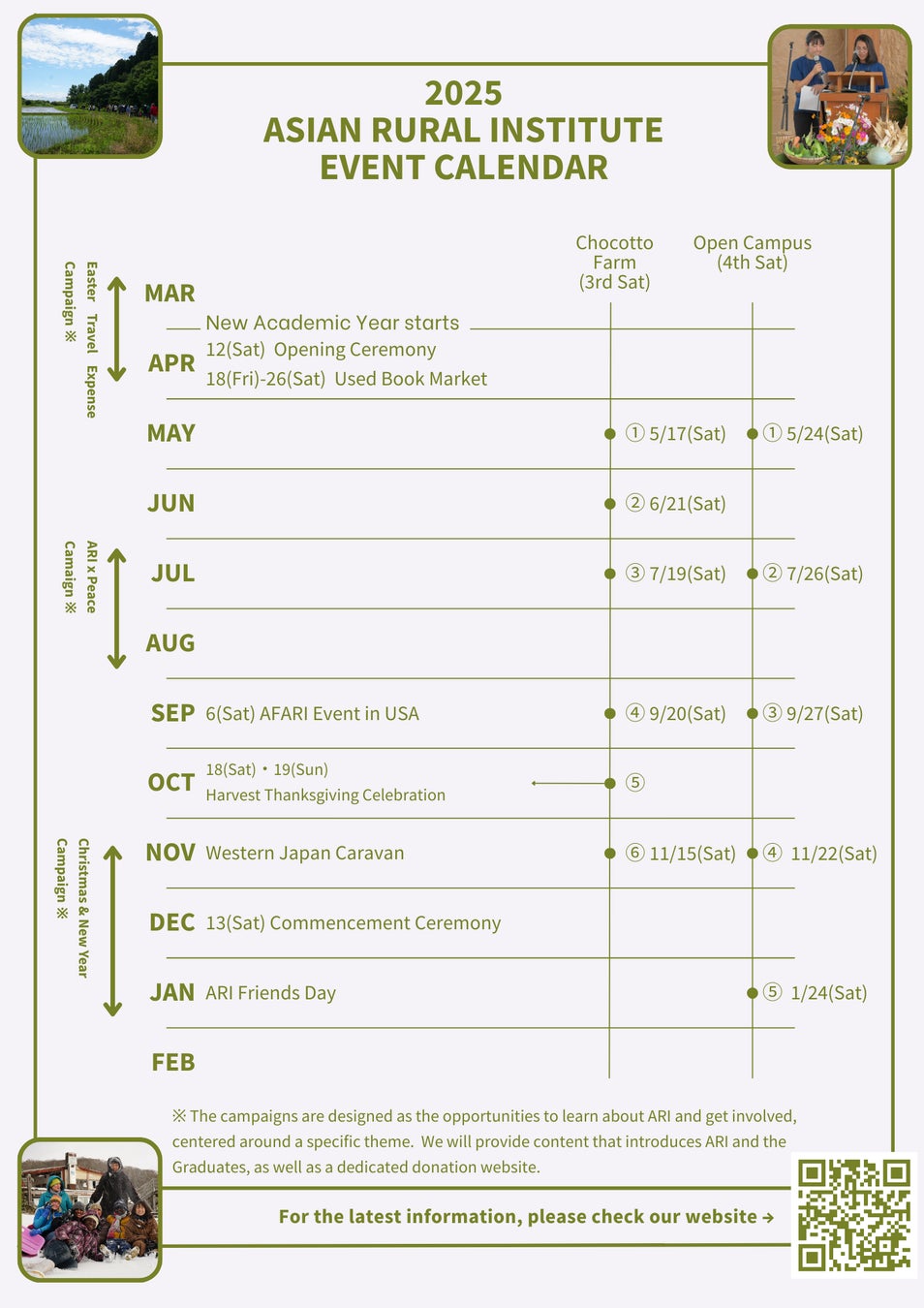 At the end of March, participants from around the globe will arrive in Japan, marking the commencement of Asian Rural Institute (ARI)’s 2025 training program. With the aim of sharing our initiatives with a broad audience, we have prepared an annual calendar highlighting the main events of 2025. The calendar is also featured on our website’s homepage—please take a moment to explore it.