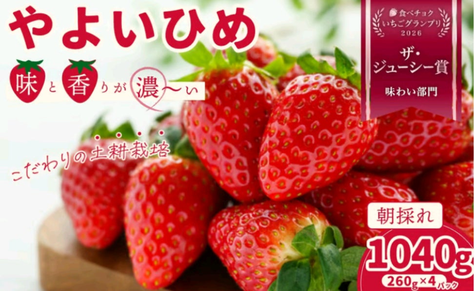 檜山いちご園では、土耕栽培にこだわり、有機質肥料を使用して土壌を健全に保ちながら栽培しています。この方法により、農薬の使用回数を減らし、アミノ酸やミネラルを豊富に含んだ、非常に美味しく安全な高品質のいちごをお届けしています。朝収穫した大粒の厳選いちご「やよいひめ」を、4パックセットまたは2パックセットでご用意しています。