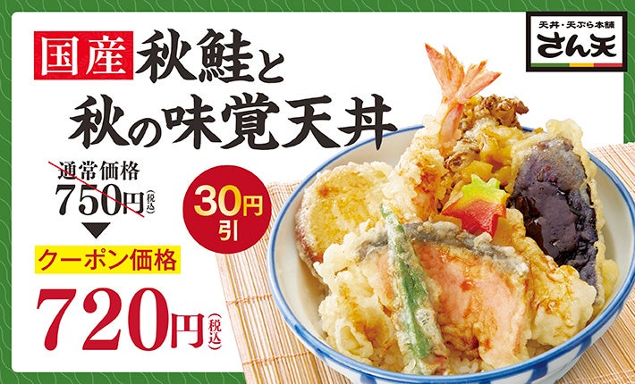 更に「天丼・天ぷら本舗 さん天」公式アプリでは、「秋鮭と秋の味覚フェア」30円引きクーポンを配信いたします。ぜひ、秋の味覚をお得にご利用ください。
