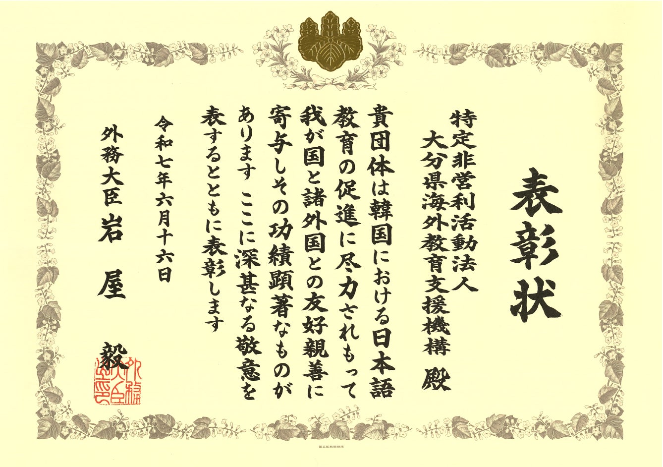 本表彰は、当機構によるこれまでの日本語教育の支援活動や、国際交流促進、日韓友好親善への顕著な功績が認められたものです。