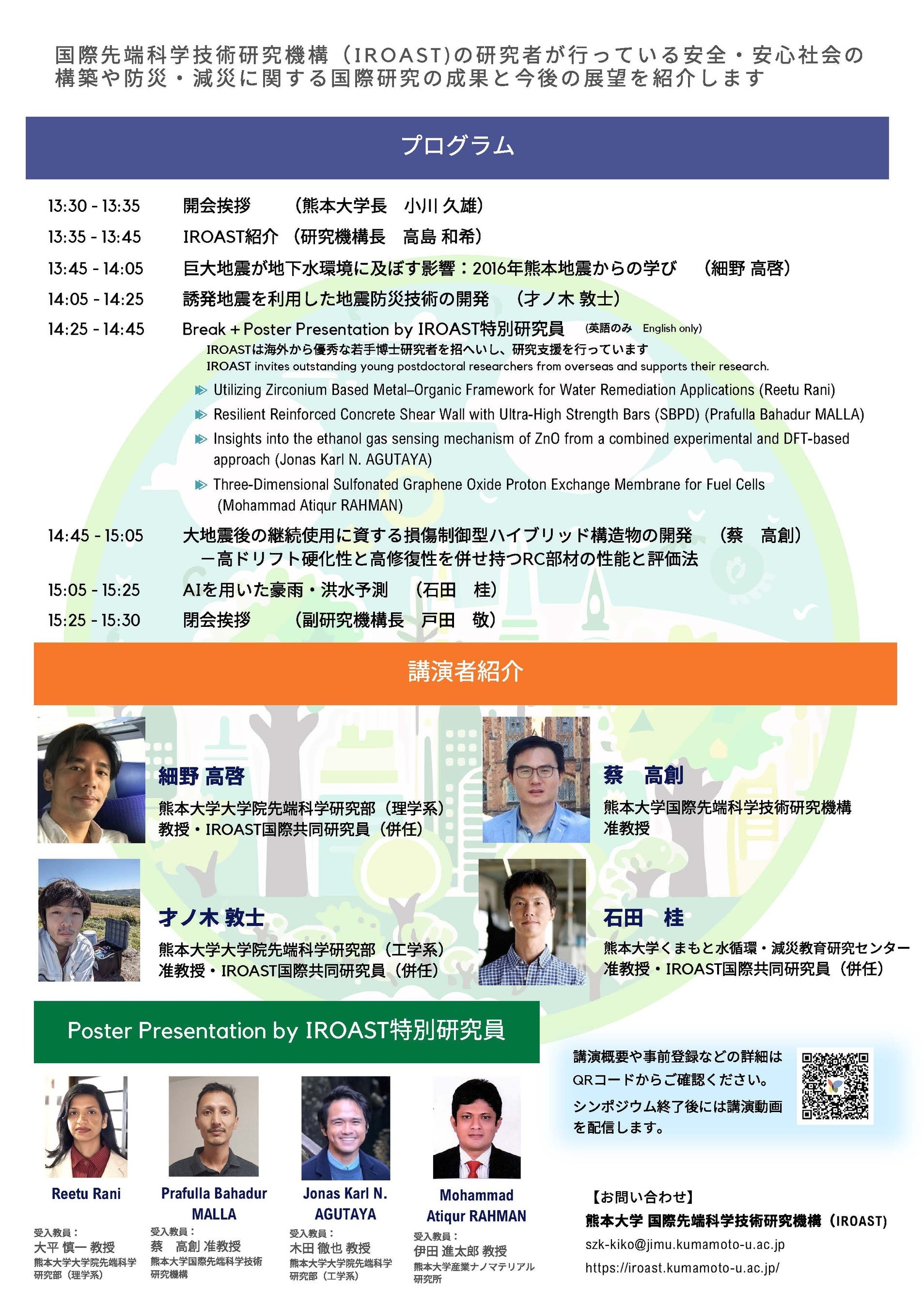 本シンポジウムは、IROASTが行っている防災・減災に関する最新の研究成果を紹介し、地域社会の安全と持続可能な発展に向けた情報提供を目的としています。