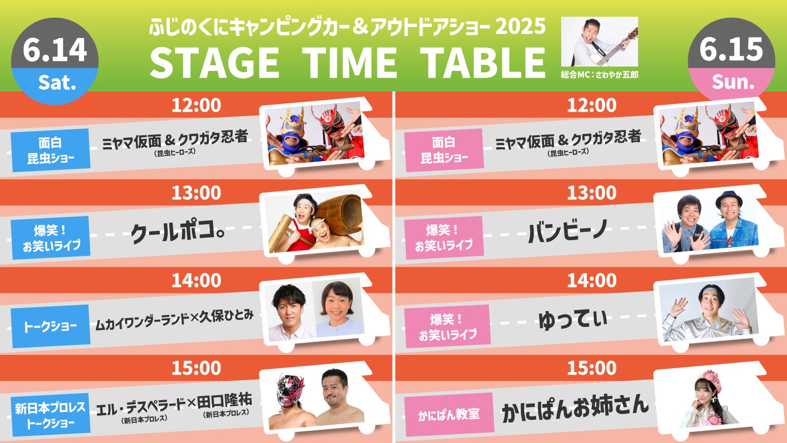 ふじのくにキャンピングカー&アウトドアショー実行委員会(事務局:一般社団法人 日本RV協会、株式会社ブシロードムーブ、株式会社ネオプロジェクト)は、2025年6月14日(土)~15日(日)にツインメッセ静岡で開催される「ふじのくにキャンピングカー&アウトドアショー2025」の最終ステージ出演者として、新日本プロレス所属のエル・デスペラード選手と田口隆祐選手の登場を発表いたします。さらに、昨年も話題となった「ゆるキャン△ピングカー mkⅡ」が今年も会場に登場決定!アウトドア・キャンピングカー好きはもちろん、アニメファンやプロレスファンも見逃せない内容となっております。