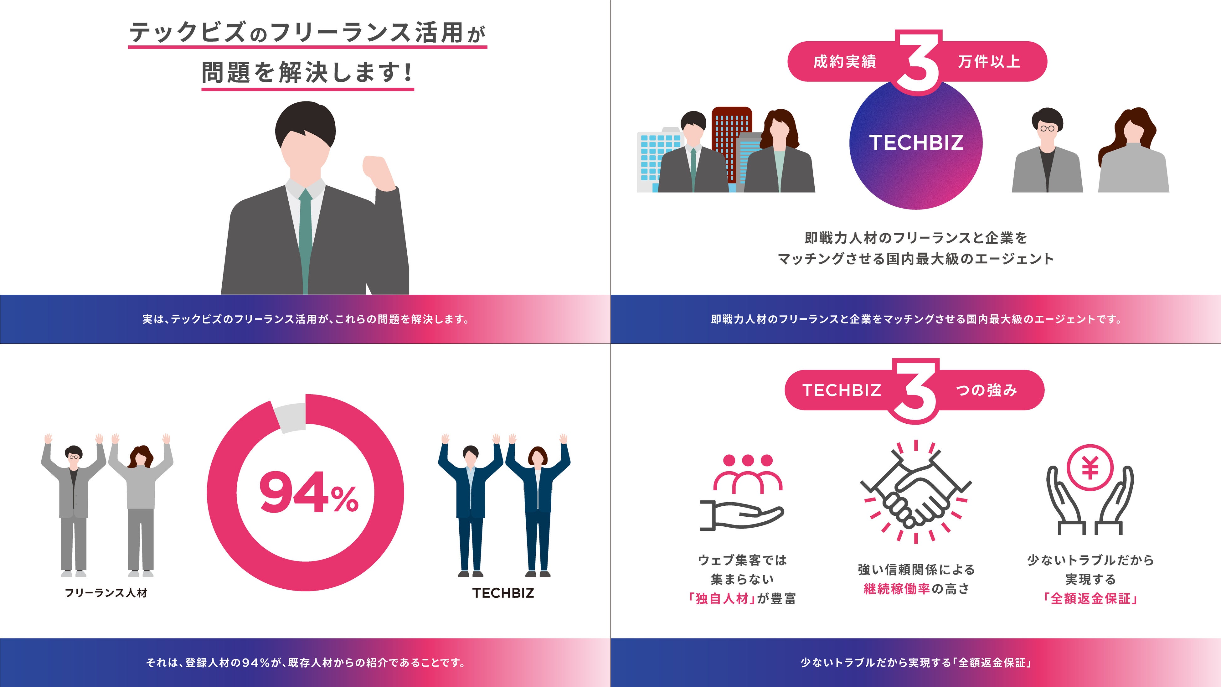 テックビズは、成約実績3万件以上の実績を持つ国内最大級のフリーランスエージェントです。最大の特徴は、登録人材の94%が既存フリーランス人材からの紹介(リファラル)で集まる「リファラビリティ」の高さにあります。本動画では、約90秒の中で、この「リファラビリティ」を背景とした3つの強みを紹介しています。