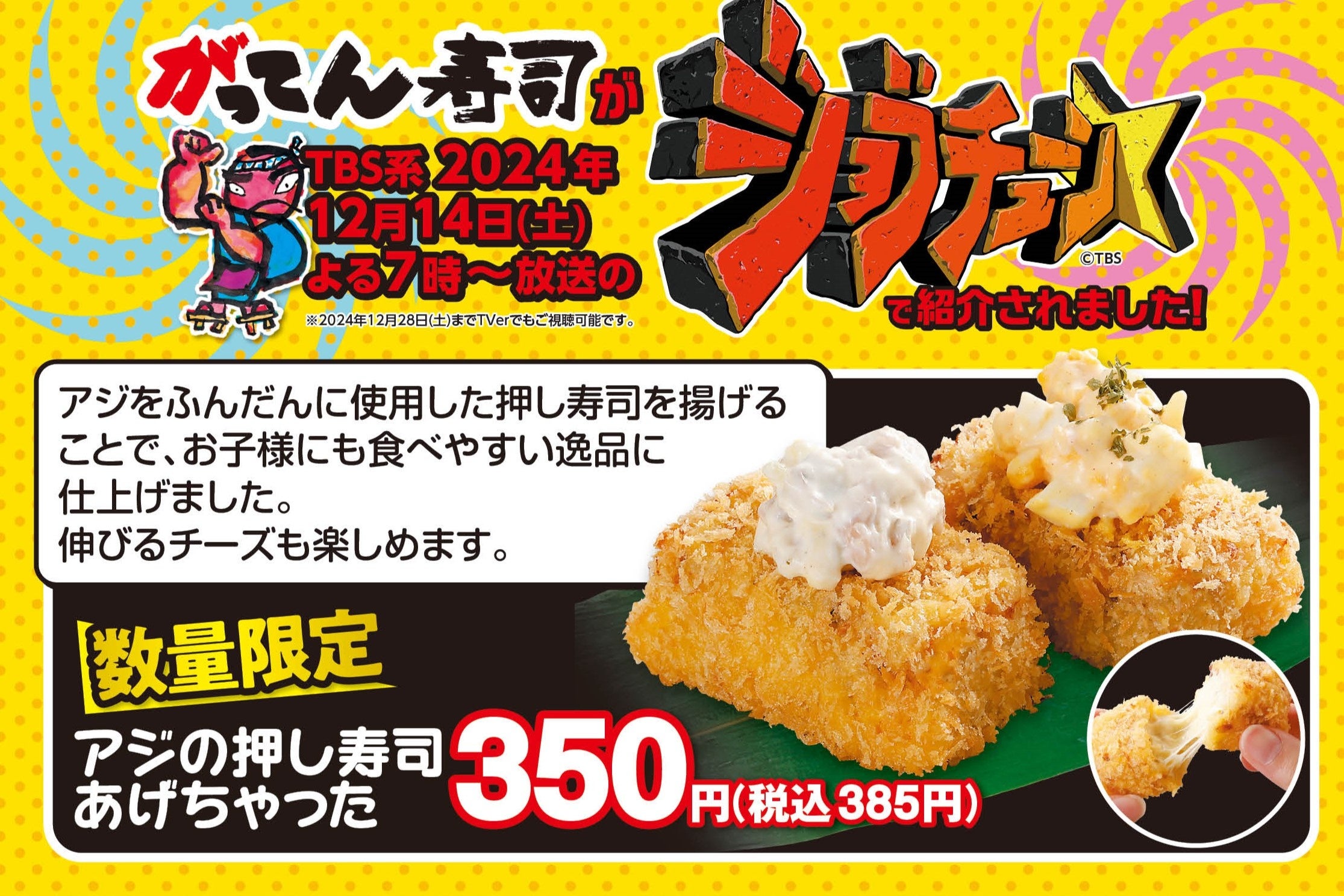 株式会社アールディーシー(代表取締役社長:大島敏彦、本社:埼玉県熊谷市)が展開するグルメ系回転寿司「がってん寿司」を運営する株式会社ジーエスアール(取締役社長:阿部康洋)、群馬県、栃木県、茨城県、宮城県に展開・運営する株式会社エヌエスアール(取締役社長:坂本正明)は、12月14日に放送されたTBS系『ジョブチューン 〜アノ職業のヒミツぶっちゃけます!』の新企画寿司チェーン3社の知識くらべ&創作寿司バトル!でがってん寿司の創作寿司「アジの押し寿司あげちゃった」が紹介されました。あじをふんだんに使用した推し寿司を揚げることで、お子様も食べやすい逸品に仕上げております。