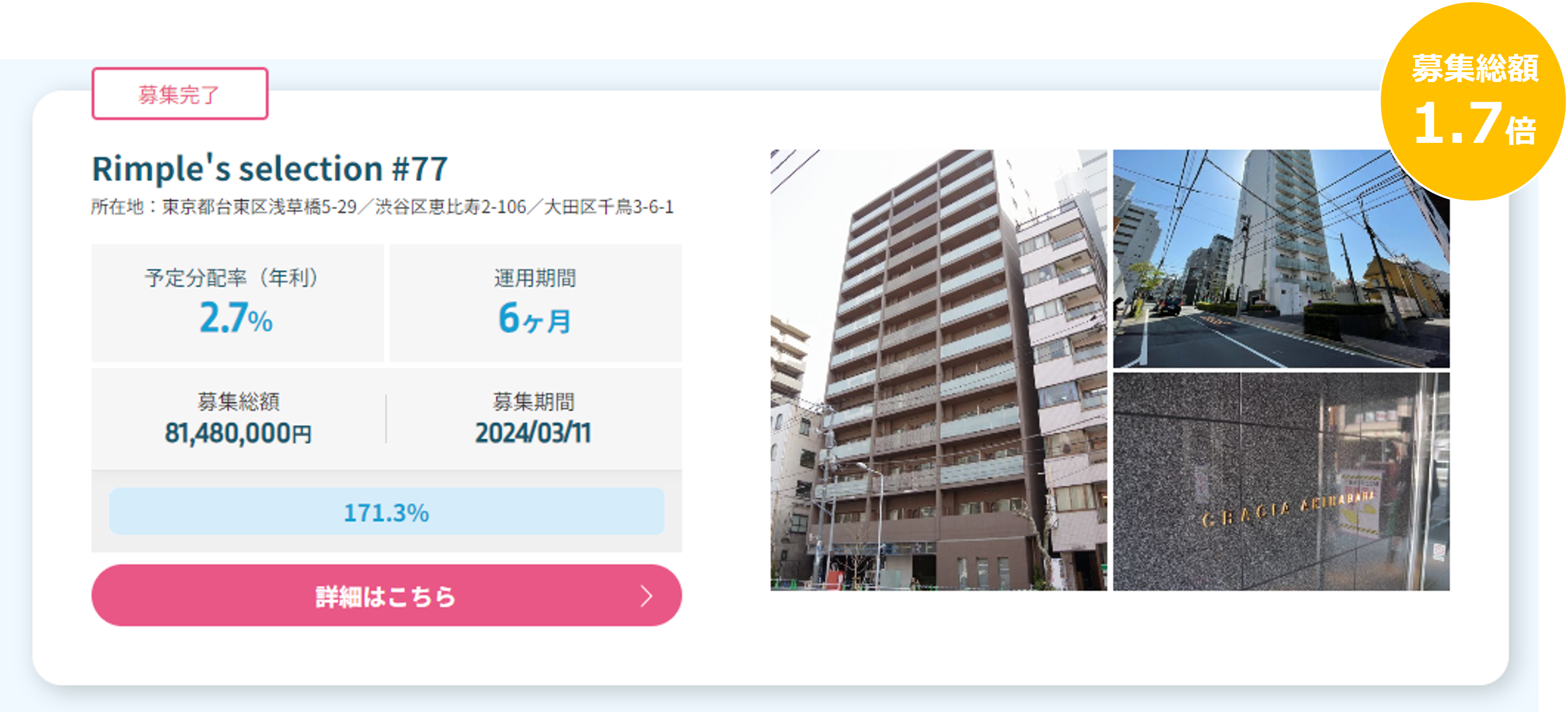 プロパティエージェントの展開する不動産クラウドファンディング Rimple’s Selection#77 募集総額171.3%の1.39億円の応募