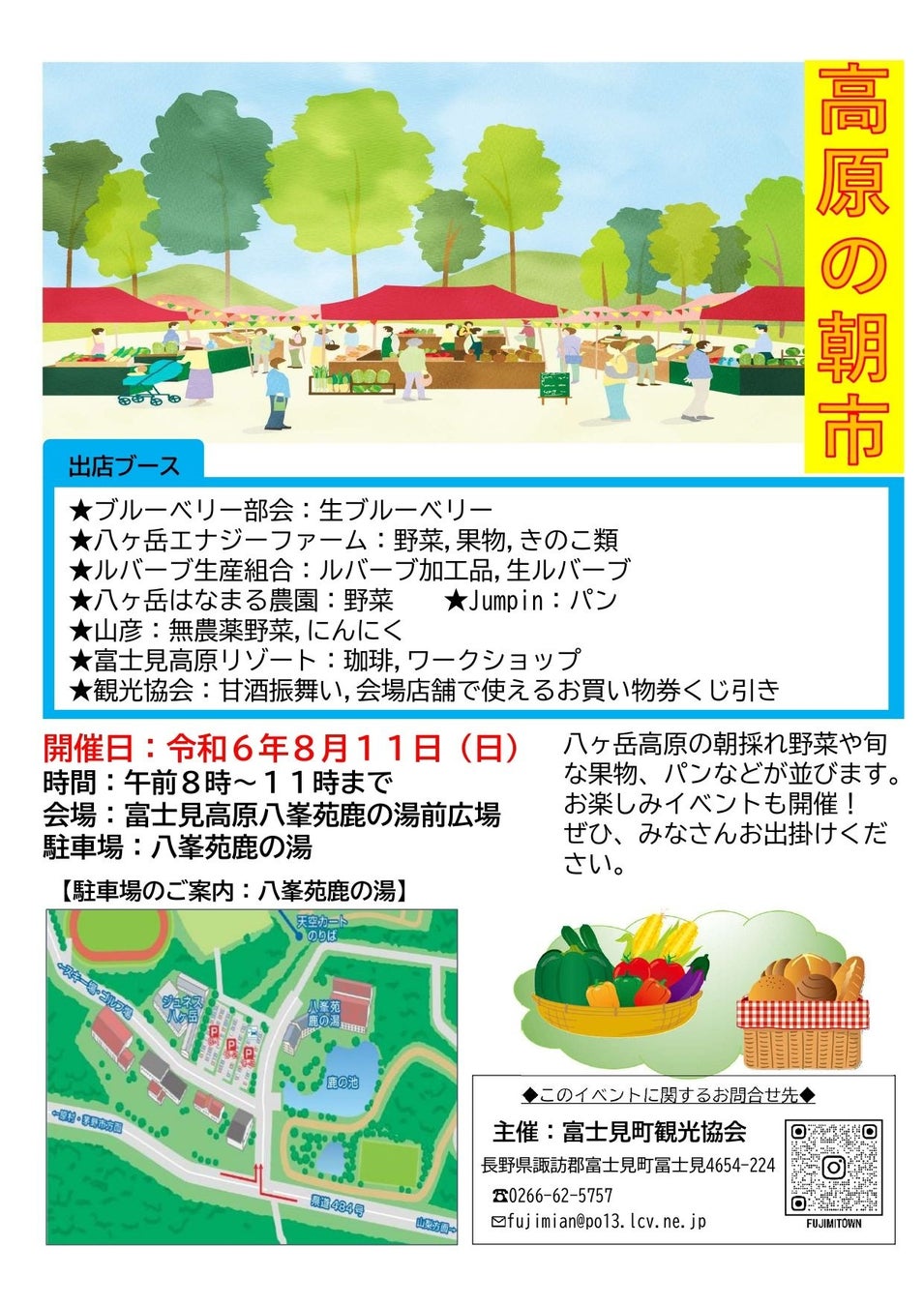 富士見高原八峯苑鹿の湯前広場にて高原の朝市を開催します。