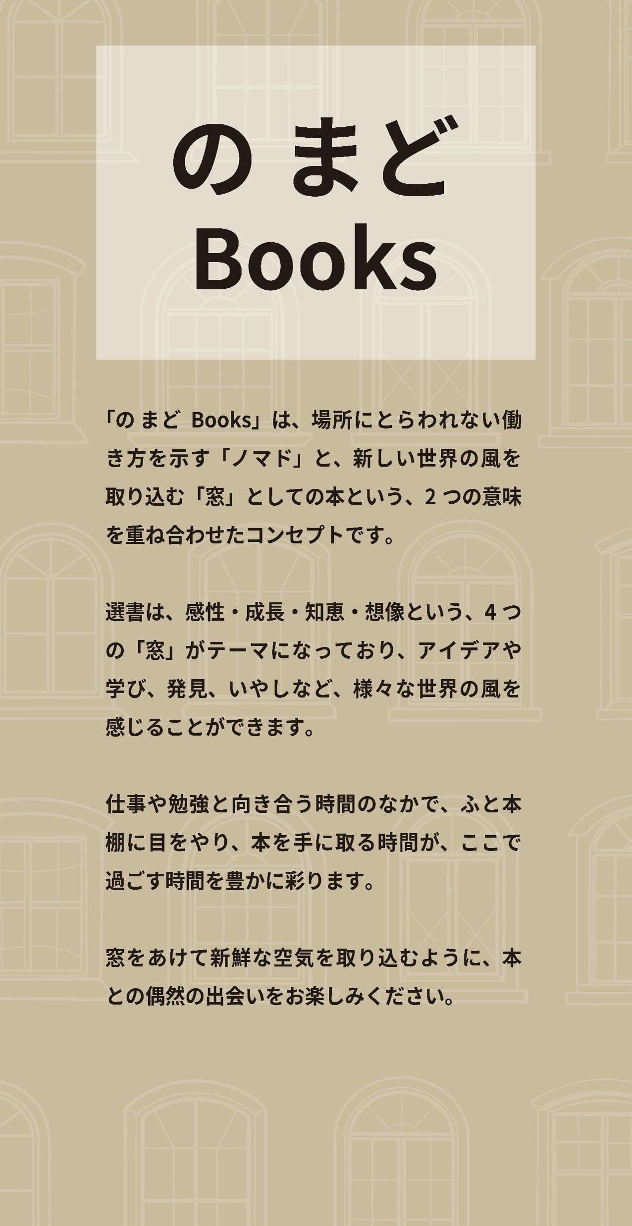 「の まどBooks」は、場所にとらわれない働き方を象徴する「ノマド」と、本を新しい世界へと繋がる「窓」に見立てた、2つの意味を掛け合わせたコンセプトです。