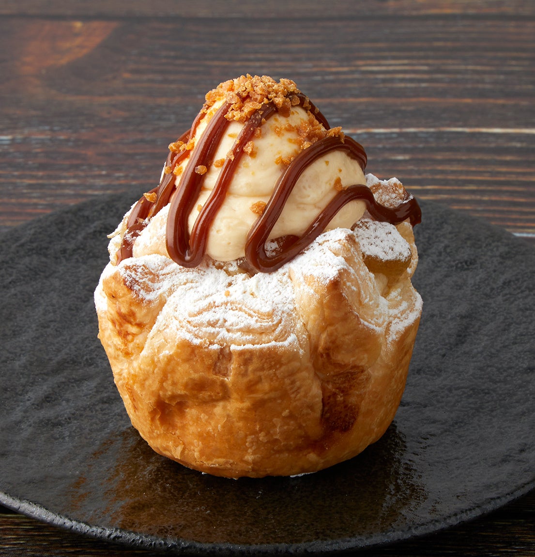 甘じょっぱくて クセになる味わいの「Apple Cup 塩キャラメル」は、りんごとカスタードクリームを包んだアップルカップと、キャラメルの甘さのなかに塩味をほんのり加えた 塩キャラメルクリームの組み合わせ。塩がキャラメルのコクを引き上げ、すっきりとした味わいの夏におすすめの逸品です。