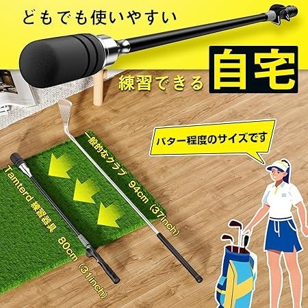 全長約80cmのコンパクトサイズで、室内でも安全に使用できます。持ち運びにも便利で、忙しい現代人でも手軽に素振り練習ができます。