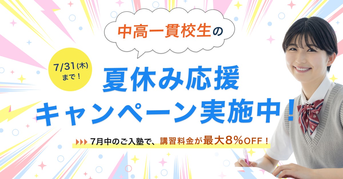 株式会社メイツ(本社:東京都新宿区 代表取締役:遠藤尚範)が運営する『中高一貫校専門 個別指導塾WAYS(以下、WAYS)』では、2025年7月31日(木)までに夏期講習にお申し込みいただいた方を対象に、夏期講習の料金が最大8%OFFとなる「夏休み応援キャンペーン」を実施いたします。なお当塾の夏期講習は7月19日(土)より開講いたしますが、開講後も随時お申し込みを受け付けております。大変お得なキャンペーンとなっておりますので、ぜひこの機会にお申し込みください。