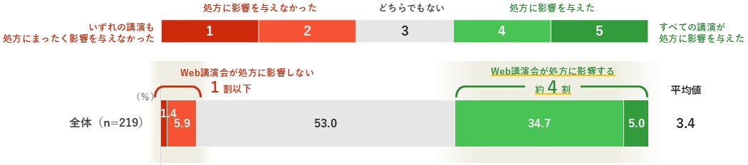「参加したすべての講演会、または一部の講演会が処方に影響を与えた」と回答した医師は39.7%に上った。53%の医師は「どちらでもない」と回答したものの、講演会に参加しても処方に影響しなかったとする医師は1割未満となった。