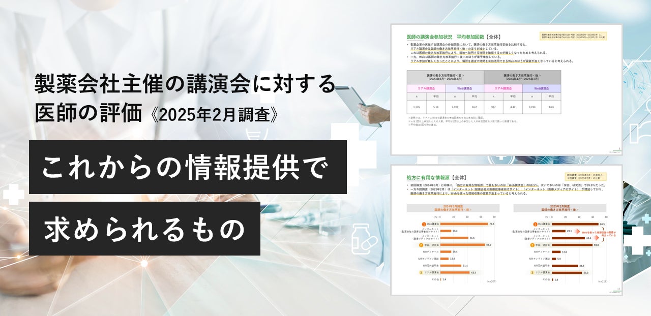 本調査は、当社が2021年3月、2024年3月に実施した「製薬会社主催の講演会に対する医師の評価」の継続調査にあたるものです。昨年の調査では、本格的なアフターコロナ期における製薬会社主催の講演会への参加状況、今後に向けての課題の抽出を行うとともに、2024年4月1日の「医師の働き方改革」に関する法律施行を控え、講演会や医師による情報収集のあり方について課題の抽出を行いました。