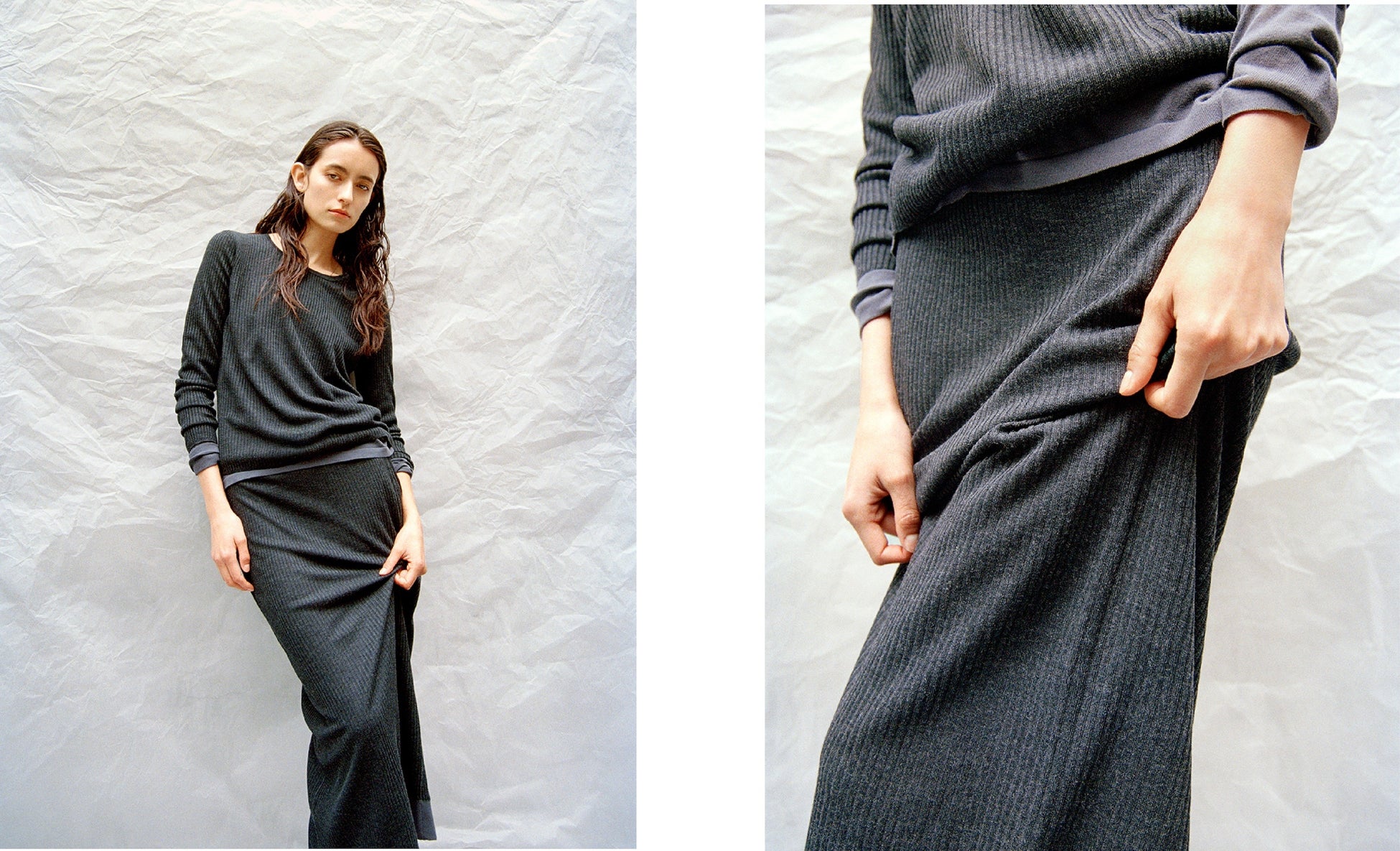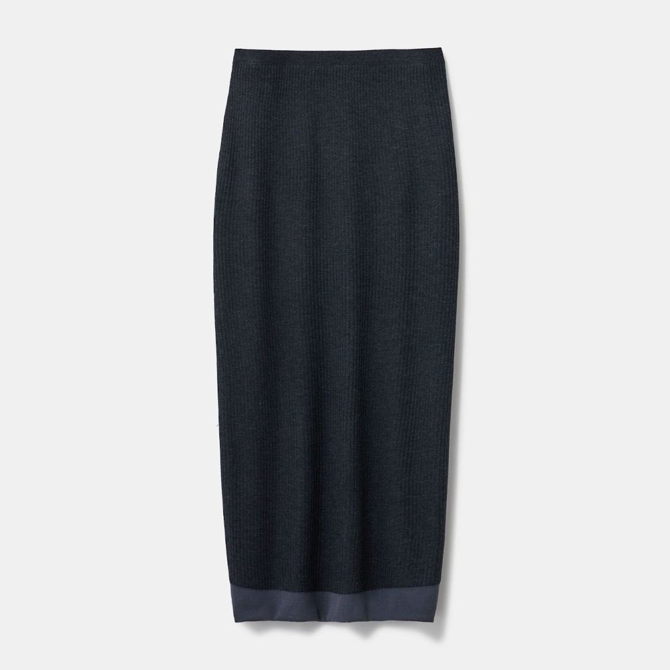 リブ編みのラインで縦長の印象をつくる「シアーリブニットスカート」。内側の天竺編みと表面のリブ編みを繋げて編むことで、自然と内側の素材が噴き出すように計算されています。女性らしさのあるタイトなアイラインシルエットです。