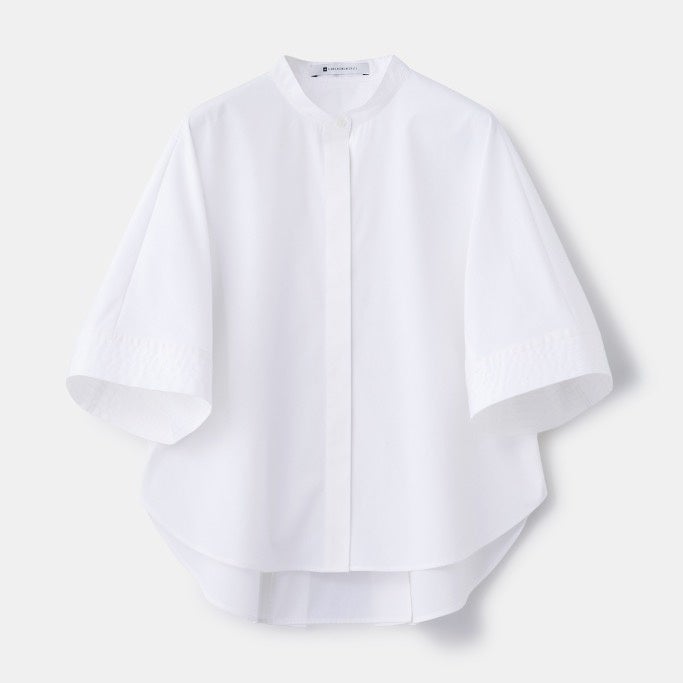 一枚で着映えする「コットンブレンドハーフスリーブシャツ」は、大胆なボリュームを持たせた袖が印象的。襟、カフス、袖の切り替え部分に微光沢のある太めの糸で入れたステッチがデザインのアクセントになっています。同素材のスカートとセットアップで着ると、エレガントな雰囲気に。