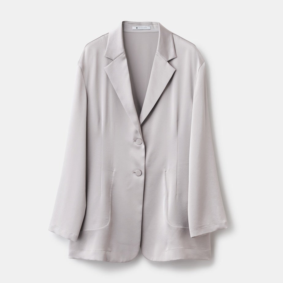「トリアセサテンジャケット」はヒップラインが隠れる着丈のオーバーサイズのシングルジャケットです。脇の縫い目に沿ってついたポケットのステッチがデザインポイント。リラクシーなシルエットをくるみボタンで上品な印象に仕上げています。