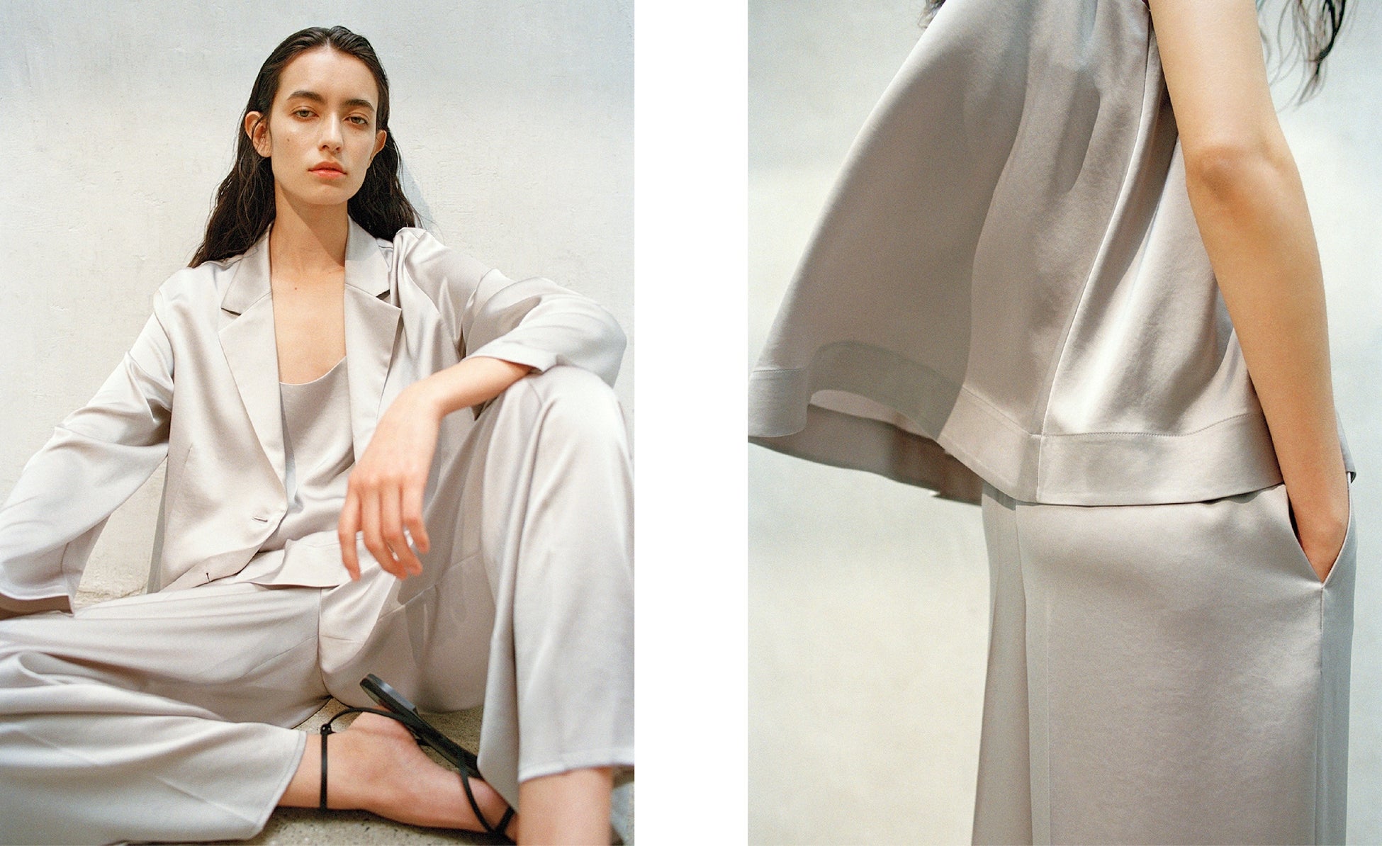 「Triacetate satin」は、上質なトリアセテートを混紡したサテン生地を使用したシリーズです。サテン生地の光沢感がつくる陰影が美しく、光の当たり具合によって表情を変える、奥行きのある輝きが魅力です。