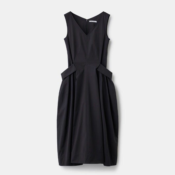 体に沿う細身のシルエットと、たっぷりとしたボリューム感のコントラストが美しい「コットンブレンドノースリーブワンピース」。ダーツの取り方や切替えで縦長の印象をつくることで、スタイルアップが叶う一枚です。広く開いた胸元がデコルテを美しく見せてくれます。