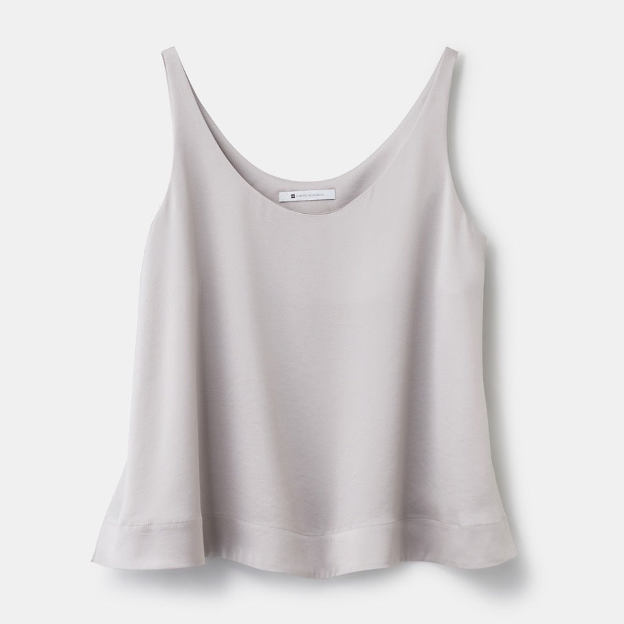 ディテールをそぎ落としたシンプルなデザインの「トリアセサテンノースリーブブラウス」は、肩ひもを可能な限り細く仕上げ、華奢で繊細な印象に。デコルテ周りや袖周りは、素材の高級感を損なわないようステッチレスにし、裾に向かってドレープが生まれるような仕立てにしています。