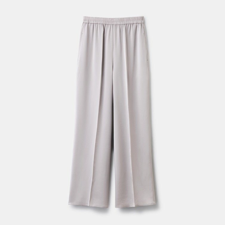 「トリアセサテンフルレングスイージーパンツ」はサテン生地の落ち感を活かしたボリュームのあるシルエットのワイドパンツです。たっぷり使った生地が美しいドレープを生み出しています。ウエストは総ゴムでリラクシーな着心地に。腰回りはギャザーを少なくしてすっきりと仕上げています。
