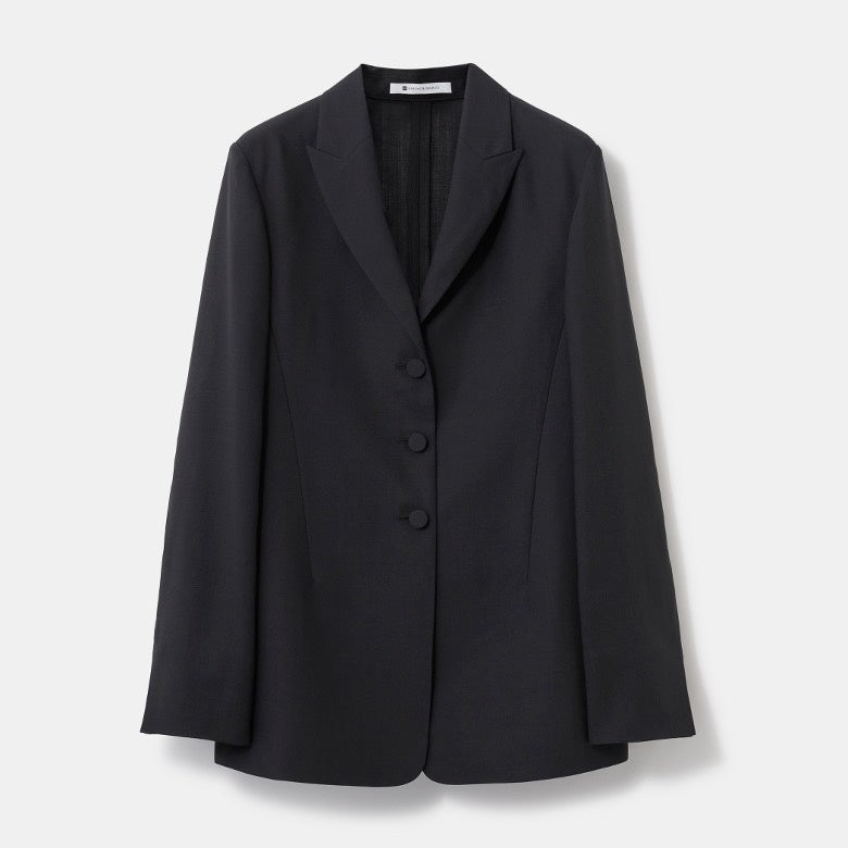 「ウールブレンドジャケット」は、斜めにダーツをとり、ウエストに程よく絞りを入れたバージャケットです。ボタンを高めの位置にすることでウエストラインを高く見せてくれる効果も。ミニマルなデザインはお仕事服としても着られるので、秋口からのスーツスタイルにもおすすめです。