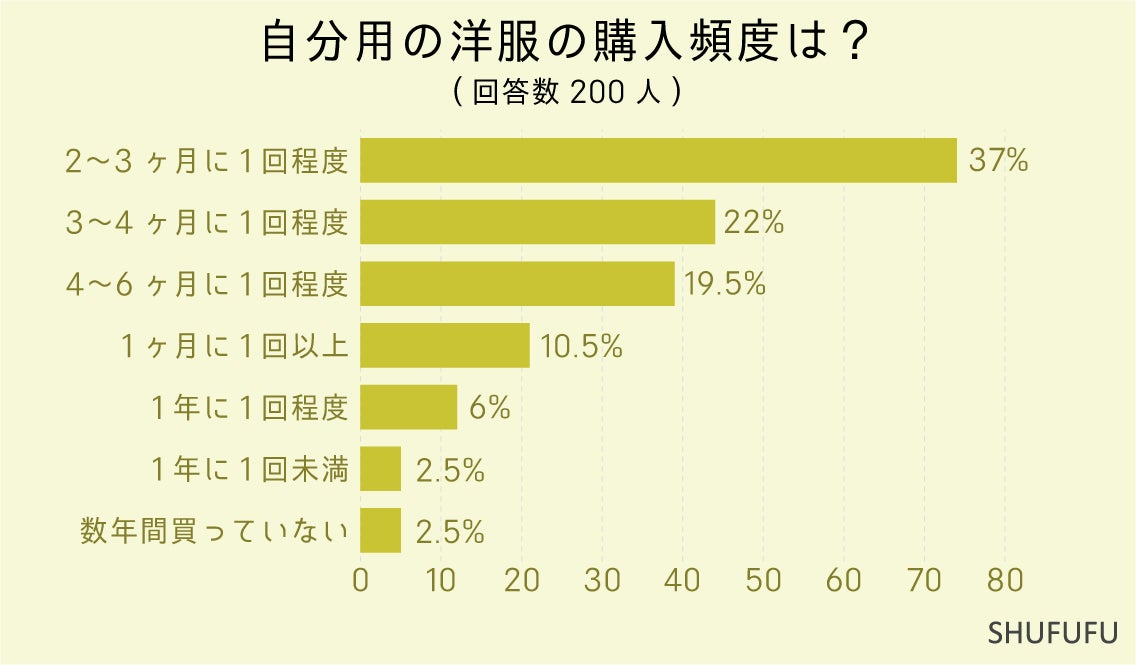 自分用の洋服の購入頻度に関しては1位「2~3ヶ月に1回程度(37%)」、2位「3~4ヶ月に1回程度(22%)」でした。数年間買っていないと答えた方は「2.5%」いらっしゃいました。