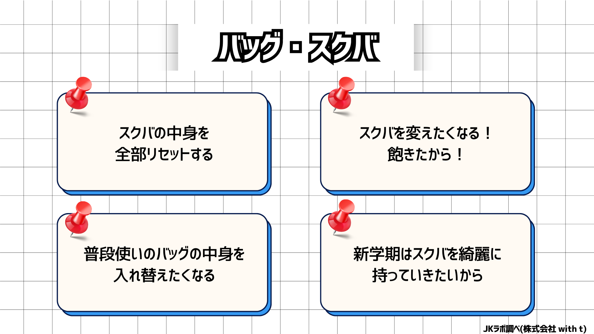 「スクバの中身を全部出してリセット」など、毎日使うバッグの整理で心機一転。