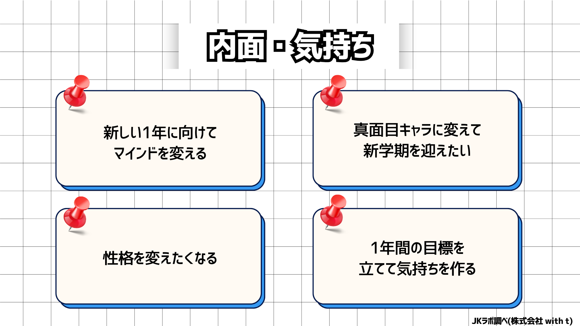 「自分の性格」や「気持ち」を切り替え、ポジティブなマインドで挑みたいという内面のリセット。