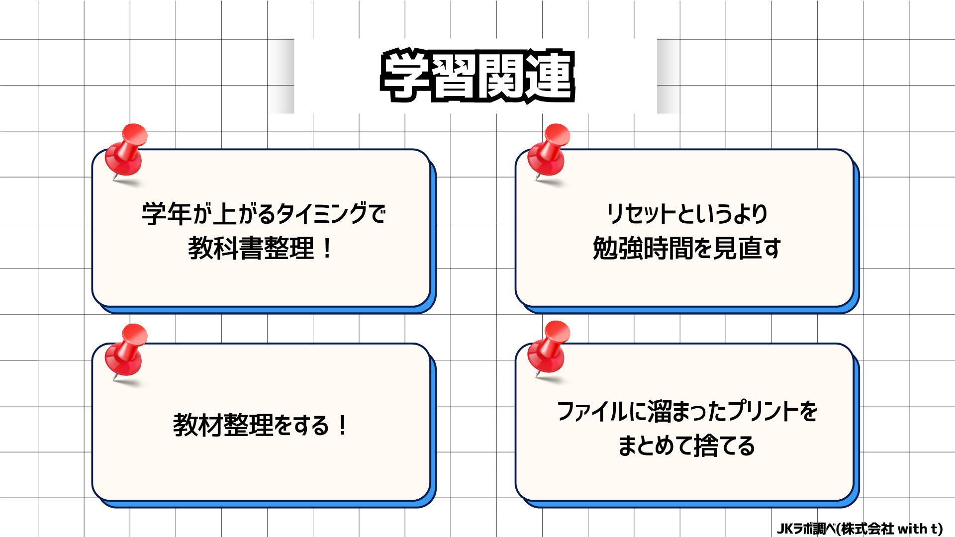 溜まったプリントや古い教科書の整理、勉強時間の再設定など、効率的な学習環境を再構築。