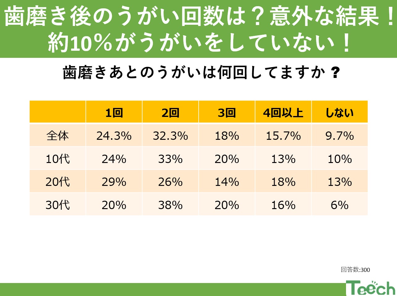 「歯磨き後のうがい回数は?意外な結果!約10%がうがいをしていない結果に!