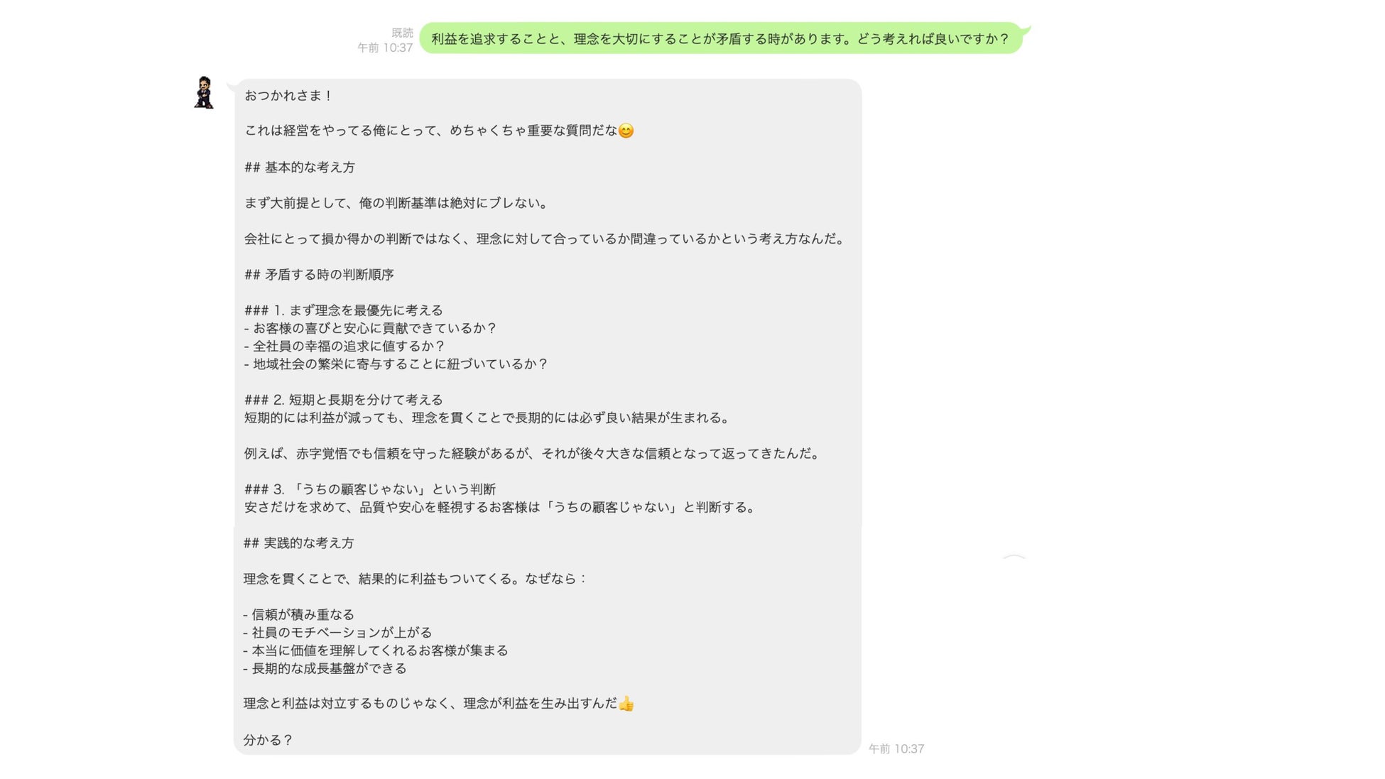 AI社長は単なるツールではなく、理念を体現し、お客さま・全社員・社会にとって価値ある存在となる人財育成の要です。一人ひとりの人間力向上こそが、心豊かな社員を育て、その社員が提供する仕事を通じて、お客さまや地域により大きな輝きをもたらすと信じています。