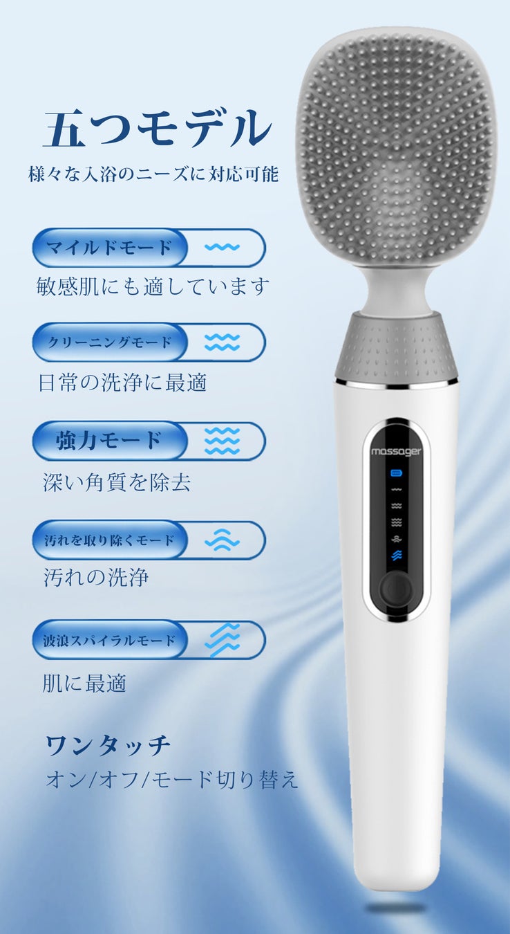高周波振動、波浪スパイラル、背中まで洗浄、一日の汚れをスッキリ!肌にやさしいシリコン素材、全肌質対応可能!角質洗浄、肌が滑らかになる五つのモードで様々なシーンに対応、2000mAhバッテリー容量