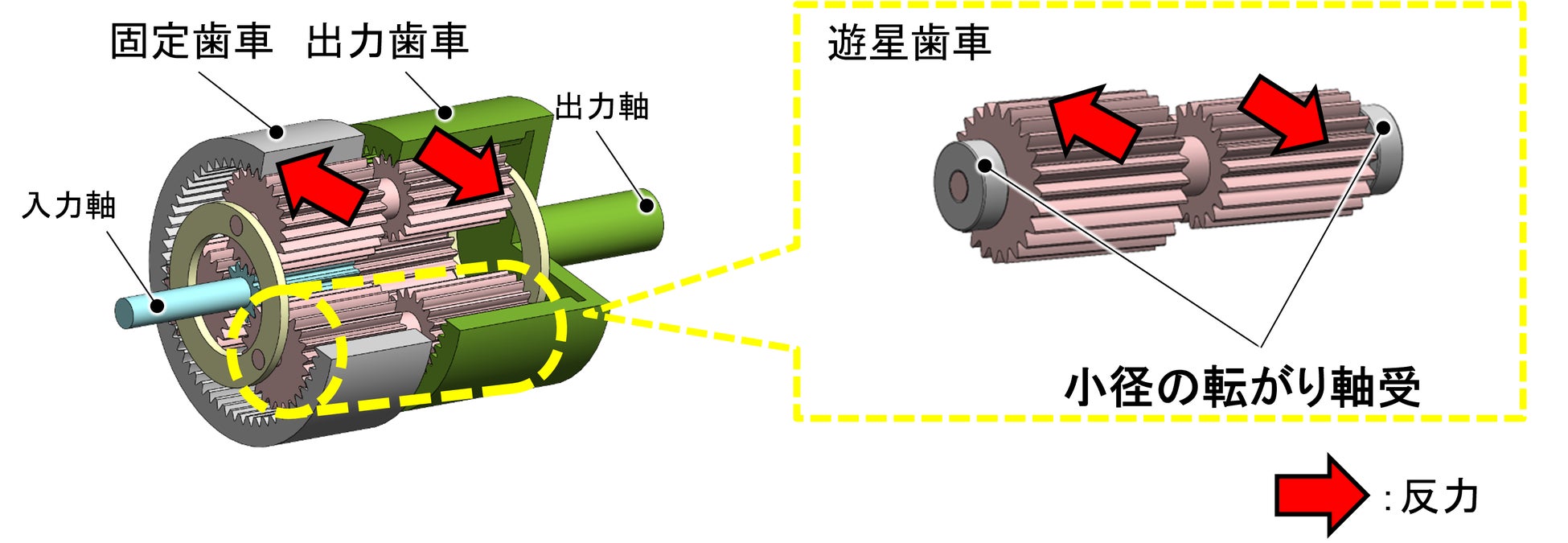 バイラテラルギアを触覚伝達装置向け減速機として小型サイズで開発するにあたり、技術課題がありました。バイラテラルギアの構造上、遊星歯車(以下図 ピンク色の歯車)と、固定歯車(以下図 灰色の歯車)・出力歯車(以下図 緑色の歯車)のかみ合いにおいて、大きな反力が発生します。遊星歯車を支持する軸受として、一般的に採用されている滑り軸受を使用した場合、その軸受の摩擦が増大し、動力の伝達効率が悪化するという課題がありました。