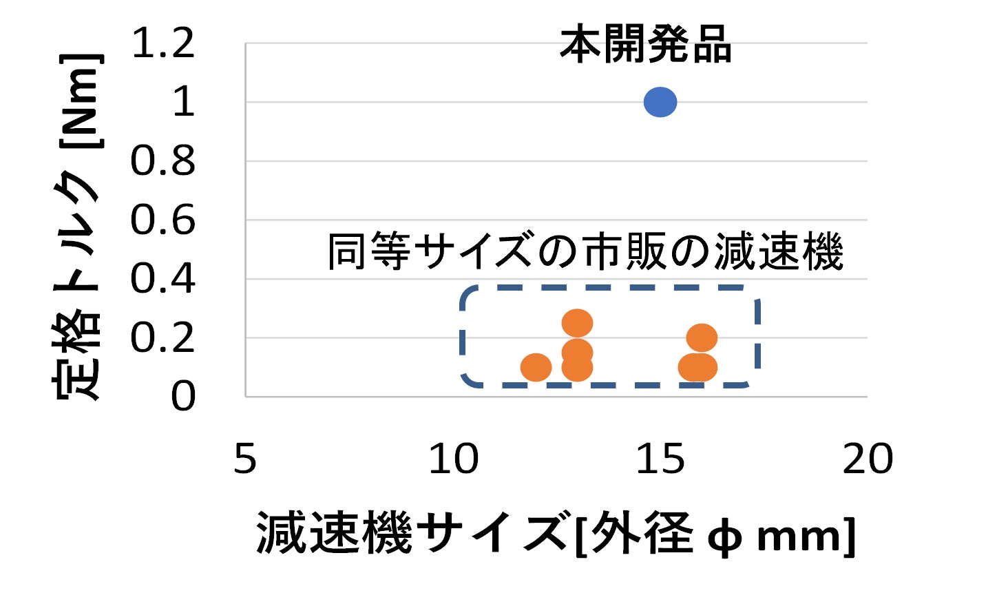 ①小型サイズでありながら、大きなトルクで駆動が可能:同等サイズの市販の減速機の中では、最も大きなトルク駆動に対応します*1。