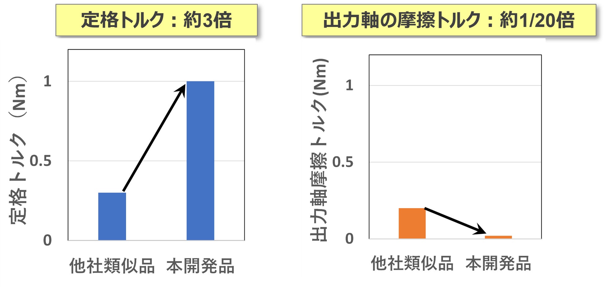 ②大小幅広いトルクの制御が可能:他社類似製品(波動歯車)に対して、本開発品が安定的に駆動できる最大トルク(定格トルク)は約3倍、その出力軸を動かすのに必要な力(出力軸の摩擦トルク)は約20分の1です*2。これにより、大きなトルクから小さなトルクまで幅広いトルクの制御が可能となります。