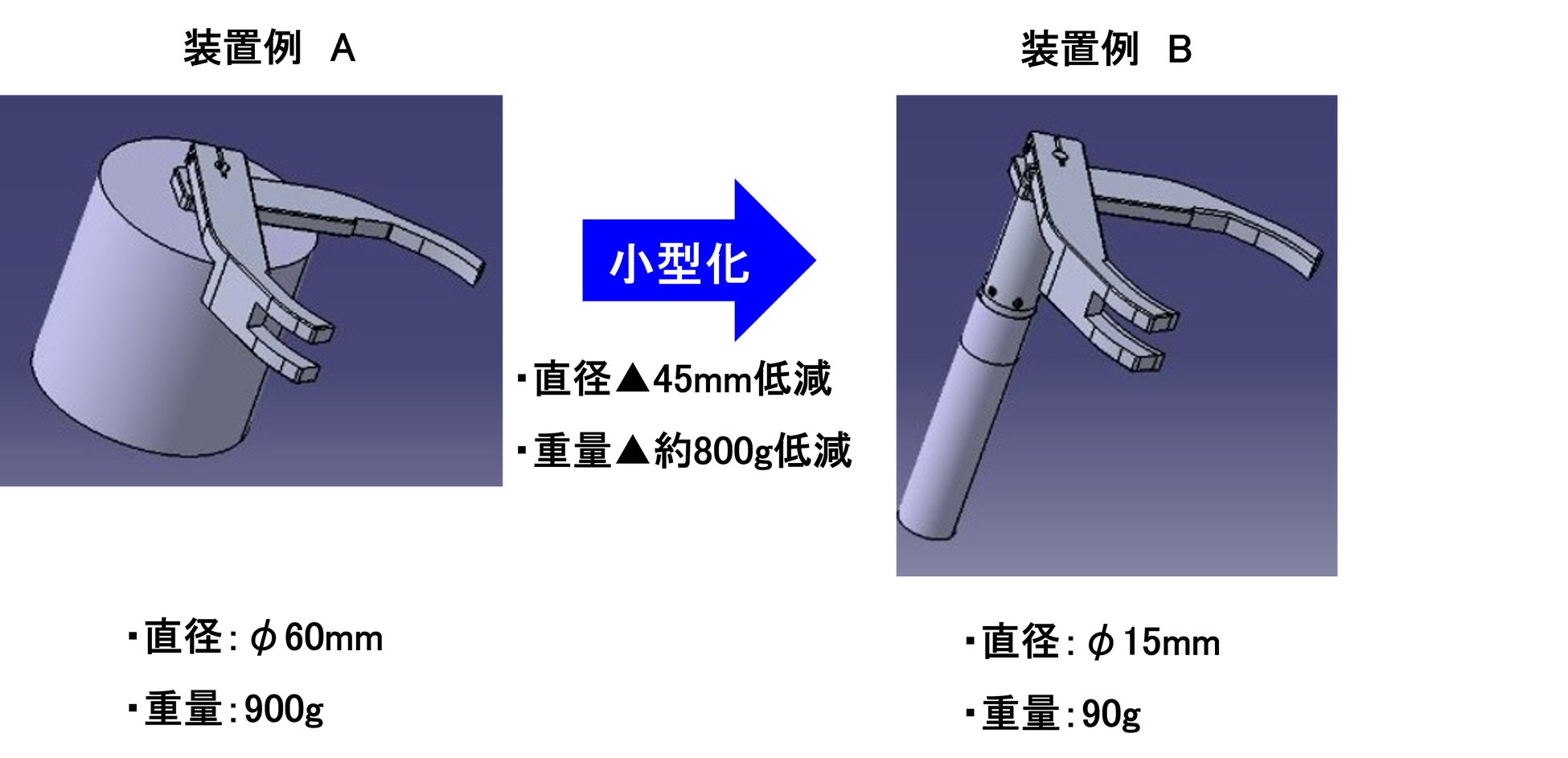 (例)従来技術を用いて開発(ダイレクトドライブモータを採用)した装置例Aに対して、本開発品を採用した装置例Bは、直径比1/4、重量比約1/10 が可能(定格トルク:ABともに1[Nm])。