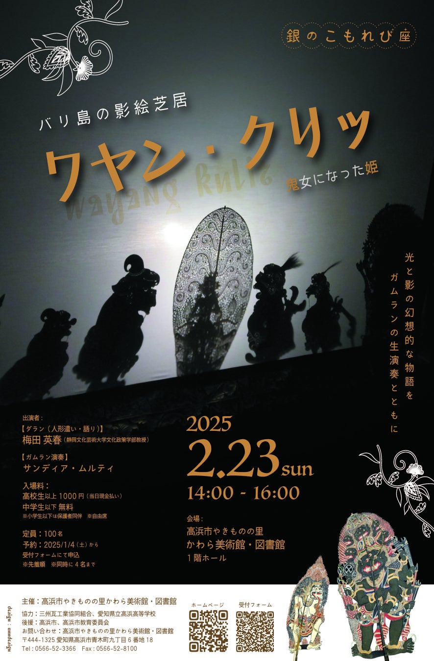 高浜市やきものの里かわら美術館・図書館では、「銀のこもれび座」事業として2025年2月23(日)に、バリ島の影絵芝居 ワヤン・クリッ~鬼女になった姫~を開催します。
