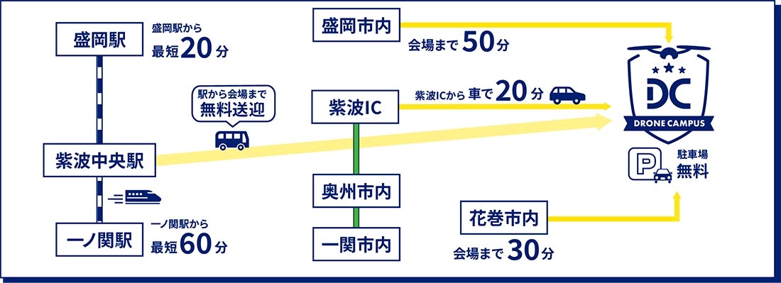 「ドローンキャンパス 岩手の空」は、閉校した小学校の施設を講習場所として使用し、広々とした空間で落ち着いてドローン操縦を学べる環境を整えました。 本講習は、盛岡市内から車で約50分、花巻市内から約30分という立地に加え、一関方面からも紫波ICを経由してスムーズにご来場いただけます。また、電車をご利用の方のために「紫波中央駅」からの無料送迎も実施。盛岡駅(最短20分)や一関駅(最短60分)からのアクセスも良好で、県内全域から受講生を広く募集いたします。 「1泊2日」の短期集中形式により、橋梁点検や災害対策など、地域の課題解決に貢献できるドローンパイロットの育成を加速させます。