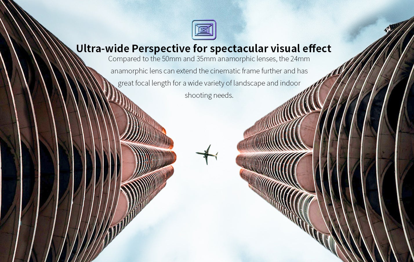 50mmおよび35mmアナモルフィックレンズと比較して、24mmアナモルフィックレンズはシネマティックフレームをさらに拡張し、広範な風景や室内撮影に対応する優れた焦点距離を提供します。