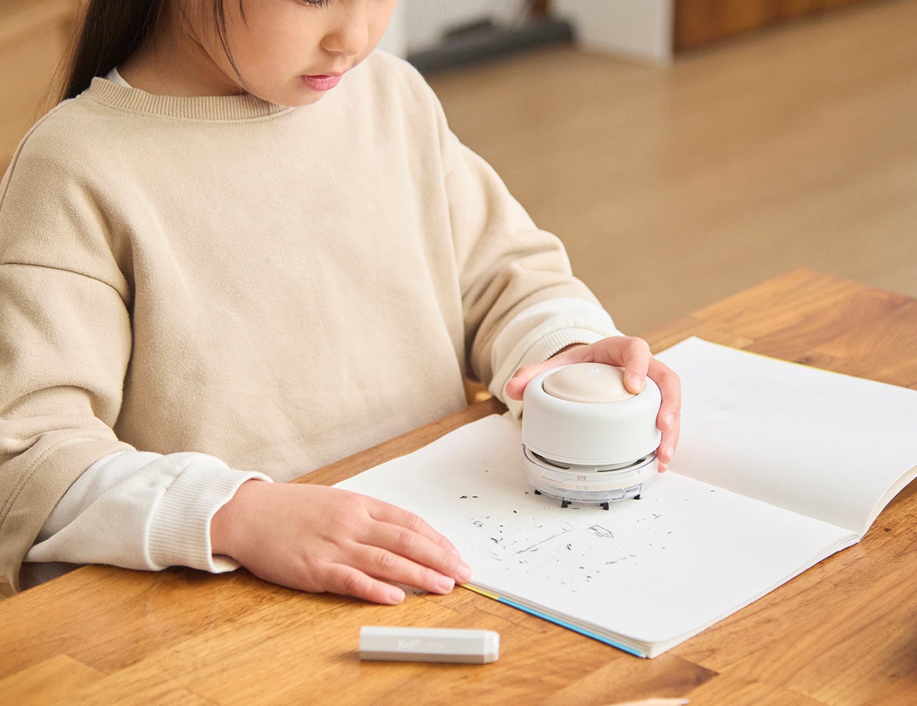 卓上クリーナーPUSHを使うと、学習・お絵描き後の消しカスなどのゴミ掃除を簡単&楽しく行えるので、お子さま自身が進んで掃除をする習慣が身に付く機会にも繋がります。それにより、親御さまも共有テーブルでの学習を支援しやすくなり、お子さまの学習意欲の向上に繋がります。