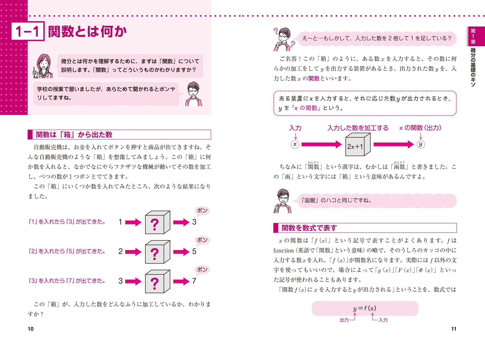 本書は、高校で習ったきりで縁遠くなってしまった微分積分をもういちど学びなおしたい人にもわかりやすいように、中学で学習する関数をおさらいしてから、微分積分の基礎をていねいに説明しています。