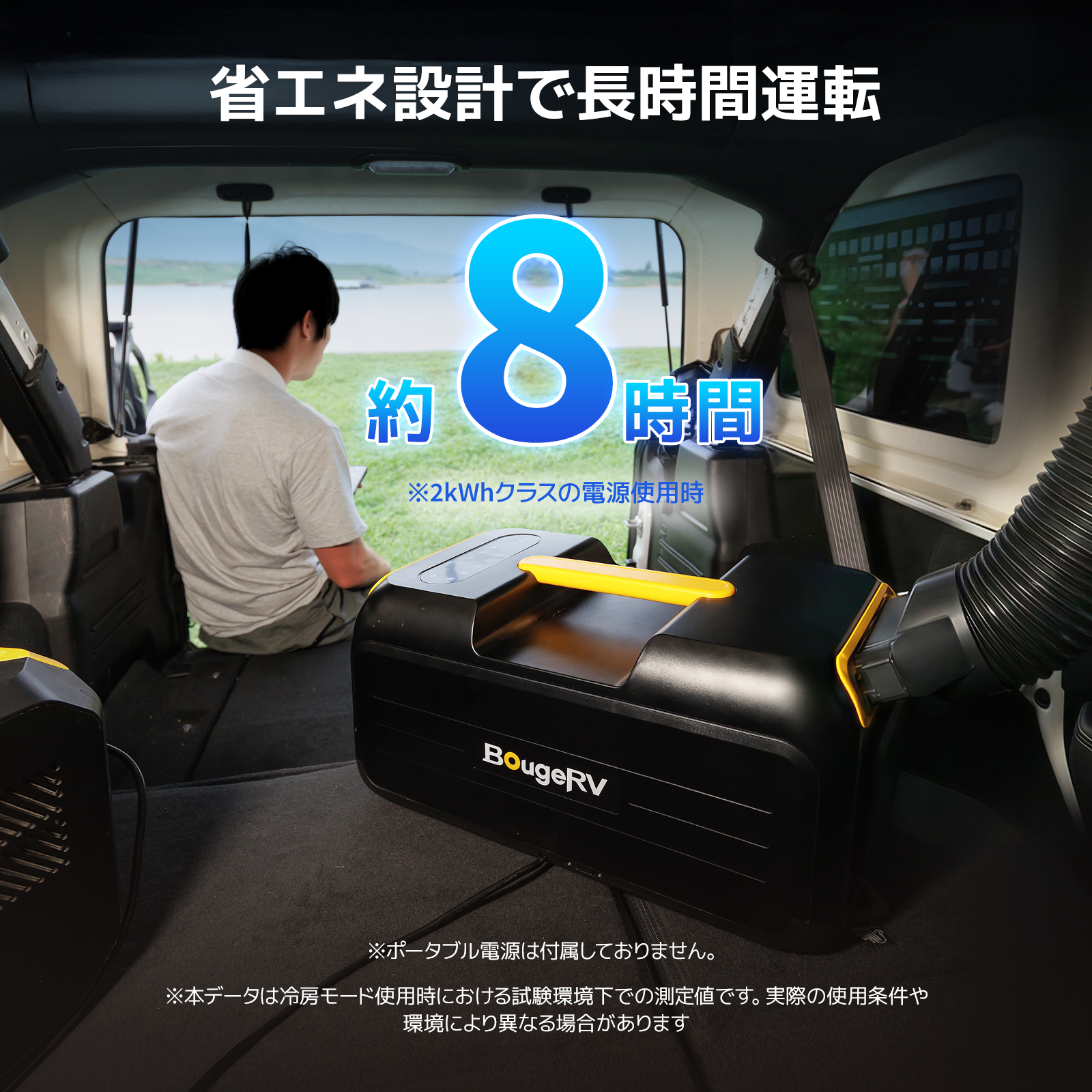 2000Whクラスの大容量ポータブル電源と組み合わせることで、連泊キャンプでも安心のスタミナを発揮します。冷房モードでは最長連続8時間の稼働が可能。電源の確保が難しいオフグリッドな環境でも、途切れることのない涼しさを提供します。