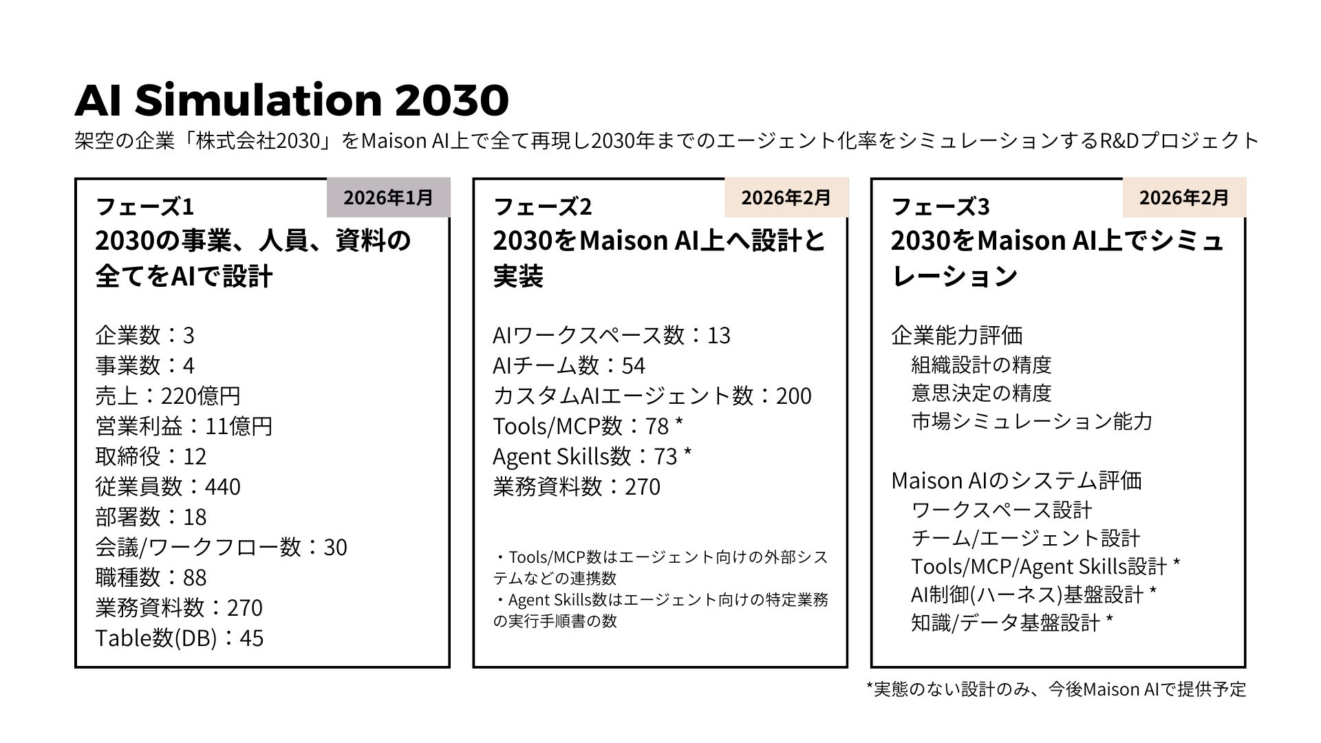 企業向け生成AIプラットフォームを開発・提供する株式会社AuthenticAI(本社:東京都港区、代表取締役:上田 徹、以下オーセンティックAI社)は、自社が提供する生成AIプラットフォーム「Maison AI(メゾンエーアイ)」において、従業員440名、AI社員200名が働く仮想の企業「株式会社2030」を構築。AI導入によって組織や財務がどう変化するかを検証するR&Dプロジェクト「AI Simulation 2030」を開始いたします。