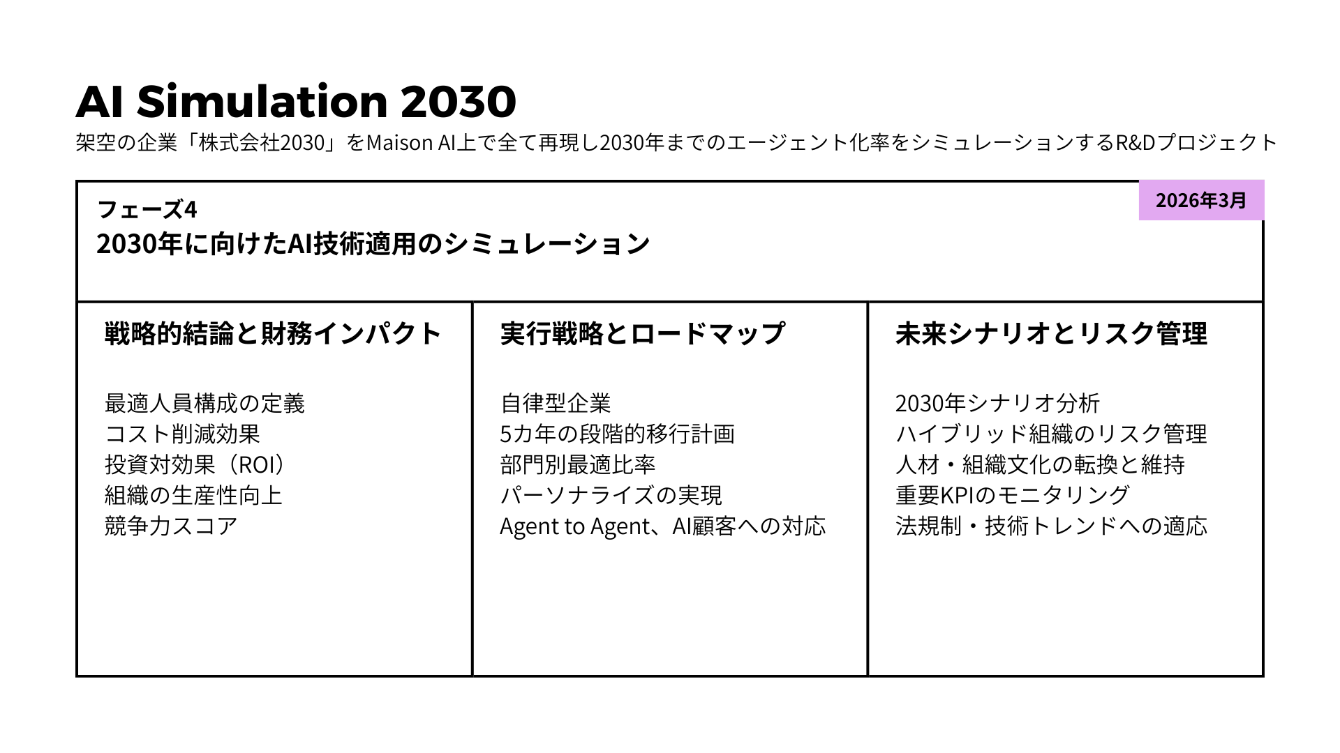 本プロジェクトは、2026年3月までにフェーズ4「2030年に向けたAI技術適用のシミュレーション」の完了を予定しています。