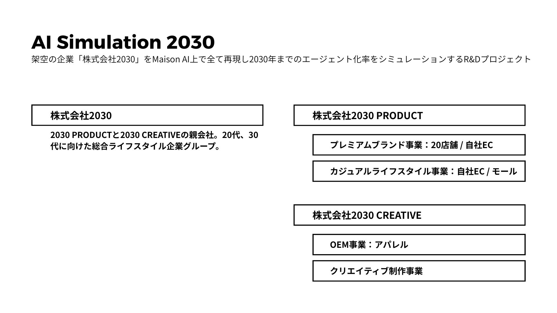 本プロジェクトでは、ライフスタイル事業を展開する架空の企業グループ「株式会社2030」(従業員数440名、部署数18)を設定。その事業活動のすべてをMaison AI上で再現・シミュレーションを行うことで、以下の3点を検証します。