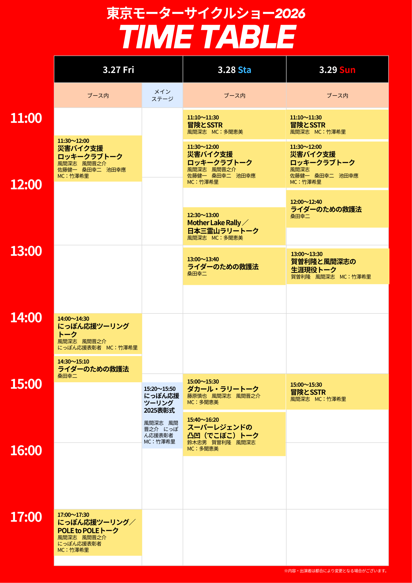 特に注目すべきは3月28日(土)15:00より登壇する現役ダカールライダー・藤原慎也氏です。日本人として初めてダカール・ラリーを完走したJRF代表・風間深志とともに、本場ダカールを体験した者だけが知る「本当の冒険」を語り合います。また、藤原氏は本年5月開催の「SSTR2026」への出走も決定しており、出走にかける熱い思いを伺います。