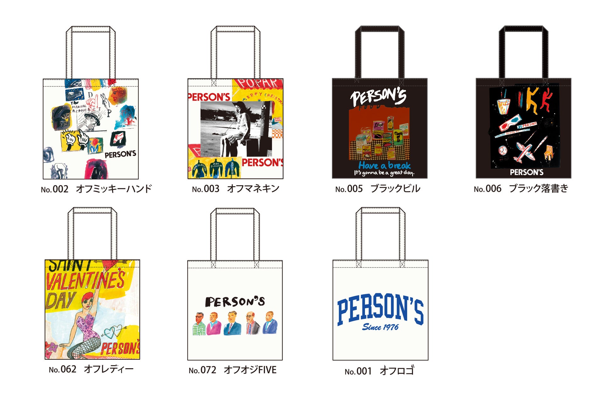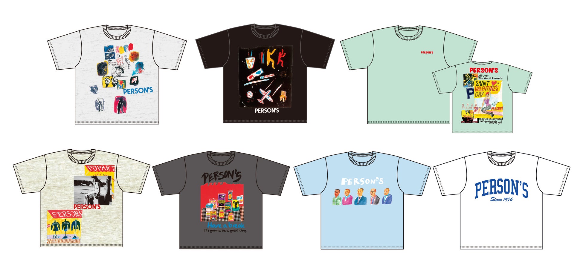 PERSON’Sのロゴワッペンをあしらったアイテム、アート柄を配したアイテムなど、ポップでカラフルなコラボアイテムを多数展開。