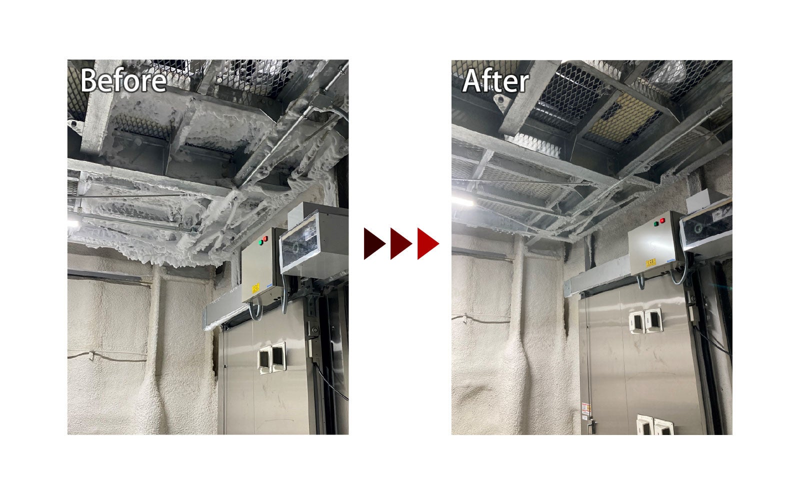 このエアカーテンの防虫効果は、すでに静岡市清水区のマグロ冷凍倉庫でも実証済みです。同施設では、秋になると「蚊柱が立つほど」大量発生する蚊の対策としてエアカーテンを導入。その結果、蚊の侵入が激減し高い評価を得ています。さらに、主な導入目的は夏場の冷気漏れ防止による電気代削減にありました。屋外が30℃を超える中、-5℃の冷凍室の開口部が長時間開放される場面でも、冷気漏れをしっかりと抑え、節電効果が大きいと現場からも好評です。